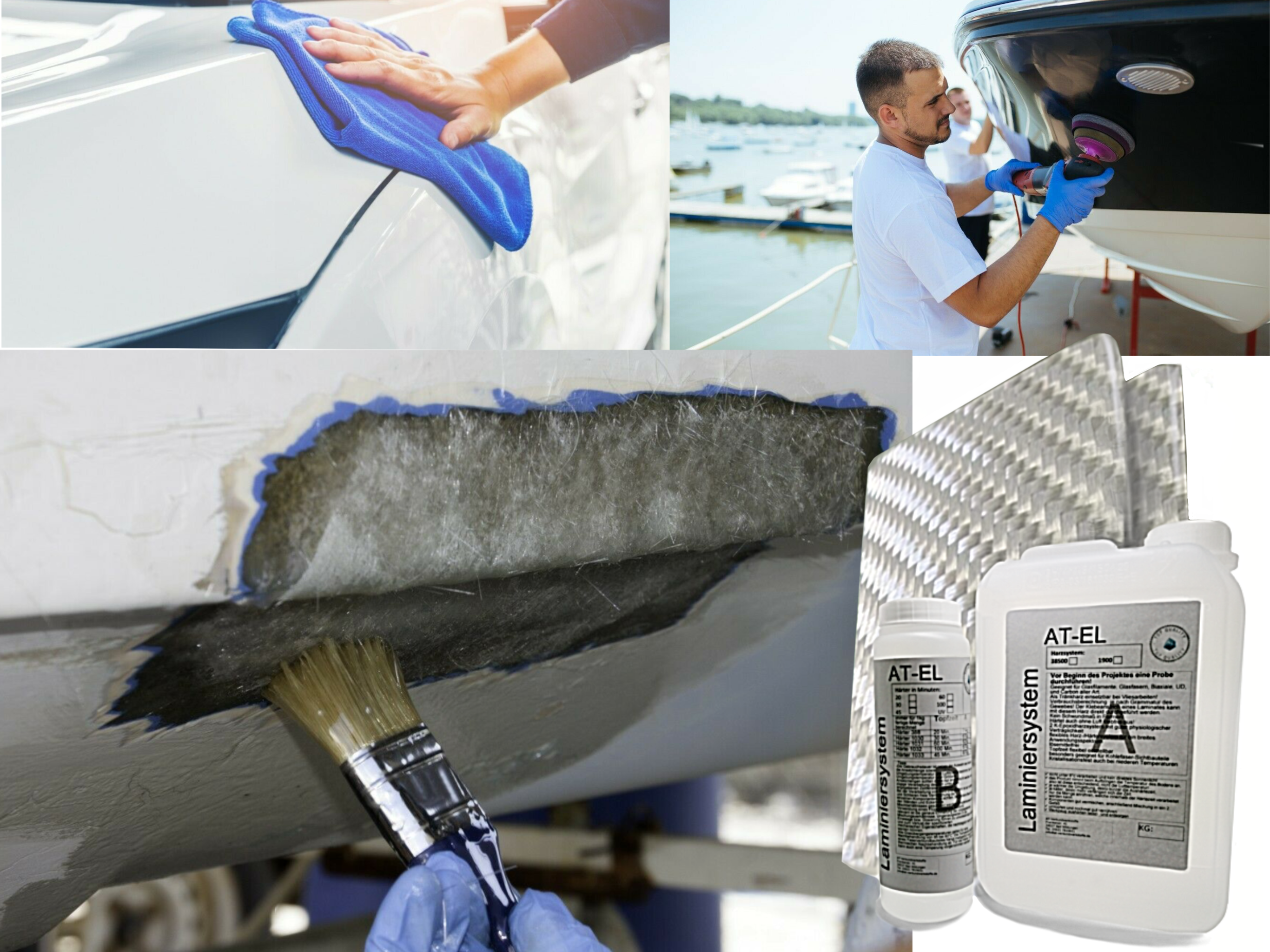 Nachdem Sie den zu bearbeitenden Untergrund vorbereitet haben können Sie nun das Harz auftragen und anschließend unser Glasrovinggewebe o.ä. Verstärkungsfasern einlegen und mit bspw. einer Entlüfterwalze andrücken und entlüften.Dies ist möglich im Nass-in-Nass- oder Trockenverfahren. Nach der Trocknung haben Sie 8-10 Tage Zeit, um die Stelle wieder zu bearbeiten, ohne das erneutes Schleifen von Nöten ist.