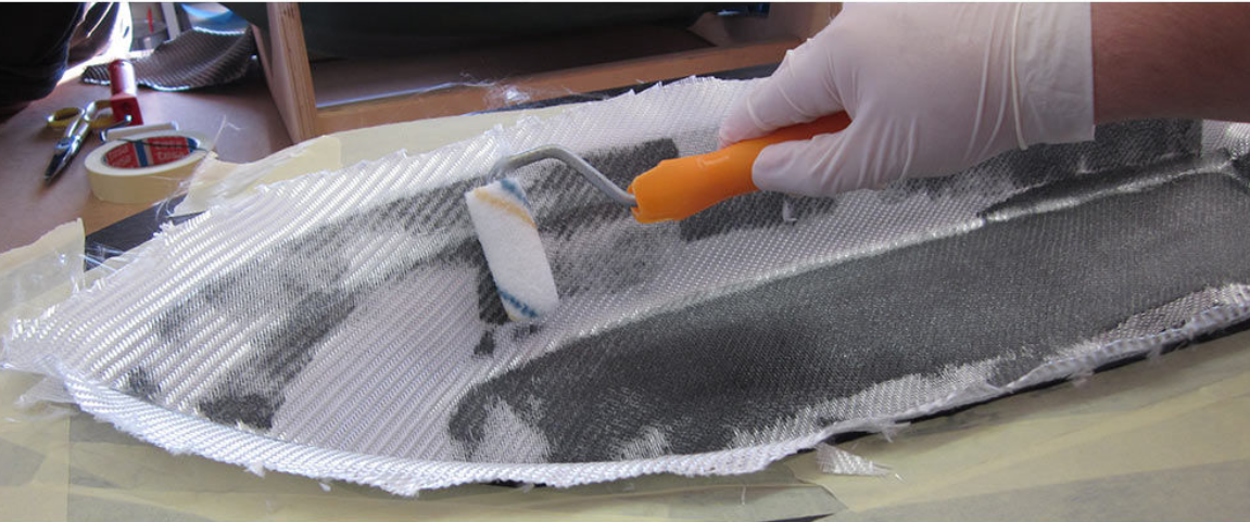 Nachdem Sie den zu bearbeitenden Untergrund vorbereitet haben können Sie nun das Harz auftragen und anschließend unser Glasfilamentgewebe o.ä. Verstärkungsfasern einlegen und mit bspw. einer Entlüfterwalze andrücken und entlüften.