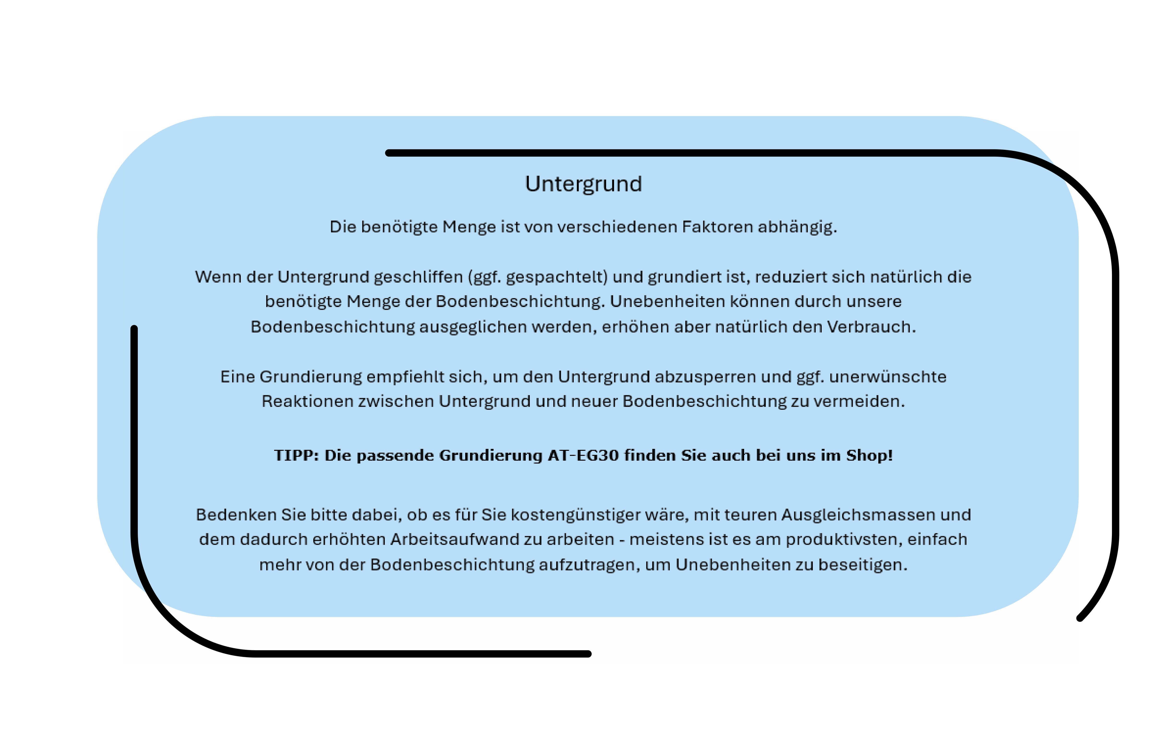 Zu den möglichen Untergünden gehören alte Grundierungen auf 2K Basis, Metall, Fliesen, Steinzeug, Beton, Estrich, angeschliffener 2K Epoxidharzspachtel, alter Vinylboden und Linolium.
